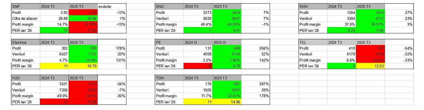 In tabelul atasat companiile marcate cu verde si-au crescut cifra de afaceri, profitul si marja de profit, iar unde este marcat cu rosu aceasta a scazut (@T3 ‘25). Pe ultima linie este evaluarea PER (1-10 verde, 10-15 galben, peste 15 rosu).