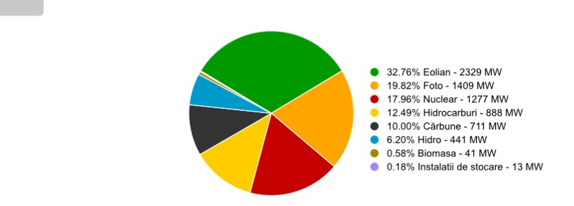Conform datelor Transelectrica Romania produce in acest moment 7113 MW si consuma 4700MW. Mixul de productie se poate vedea in graficul de mai jos(preluat de pe site Transelectrica).