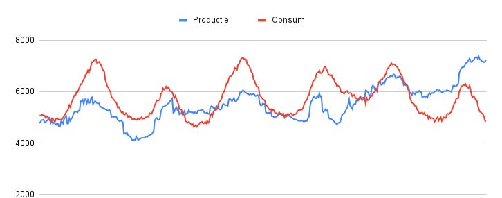 In graficul de mai jos se poate vedea evolutia productiei si a consumului in aceasta saptamana. Constant consumam mai mult decat producem. Se poate vedea insa cum in ultimele 24 de ore avem o productie mult mai mare datorita energiei eoliene!