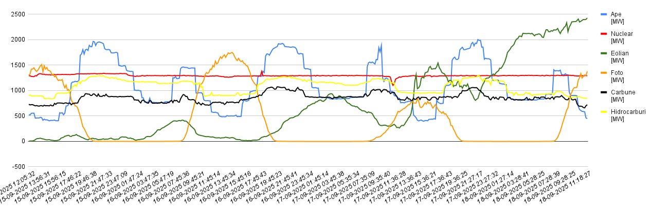 Se poate observa deasemenea ca noaptea (in lipsa energie fotovoltaice) productia de energie Hidro produsa de Hidroelectrica creste de la aproximativ 500MW la aproape 2000MW. Aceasta este fix maximul de energie produs de sistemele fotovoltaice in timpul zilei.